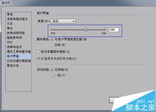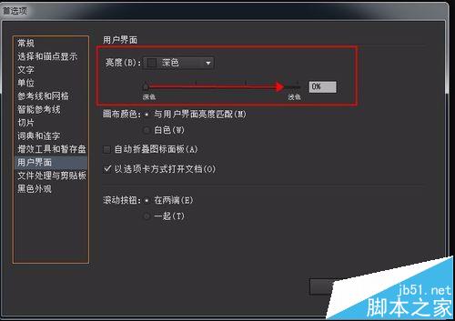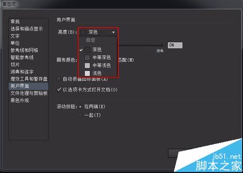 4、点开之后,我们看到了“亮度”选择框,在那个地方,选择滑块,由“深色”到“浅色”进行滑动