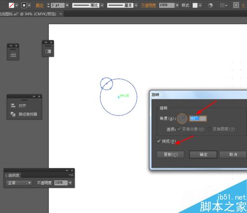2、然后再选择椭圆工具,按住shift画一个正圆图形,选中正圆图形,按R键,按Alt移动锚点的位置到中心点,再按ctrl+D复制圆形,如图所示