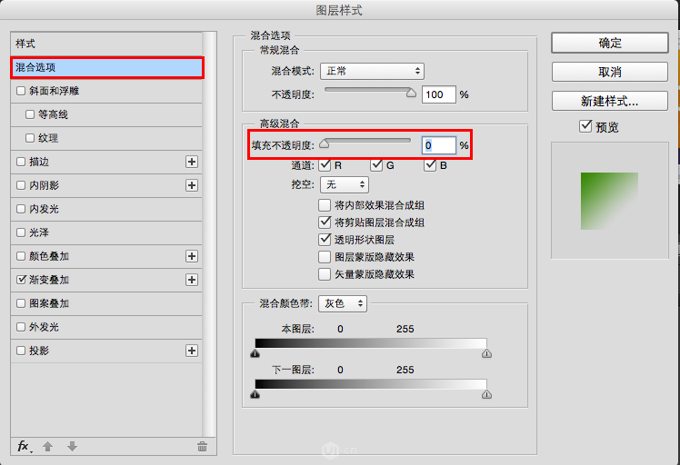8、点混合选项,设置填充不透明度为0。