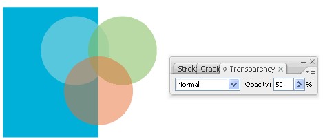 您可以添加插图画家的透明度降低的不透明物体,这样潜在的作品变得可见。 去窗口>透明开放你的透明窗口。 堆栈几个对象,并将其设置为较低的不透明度为50%底层颜色显示通过。