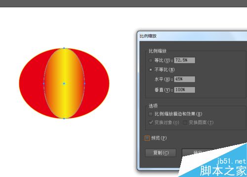 2、点击左边窗口缩放工具,快捷键S,不等比缩放45%,点复制,然后对里面的椭圆进行渐变填充。