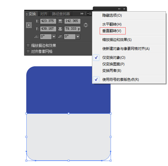 第六步:选中蓝色的的圆角矩形复制(ctrl c,ctrl f),修改填充颜色为:#fff,打开变换面板,选择"垂直翻转",如下图所示: