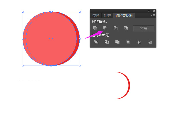 第三步:使用椭圆工具的同时按下shift键,画一个正圆,填颜色为:#fa5953,复制出一个正圆副本,打开路径查找器,选择"交集",如下图所示: