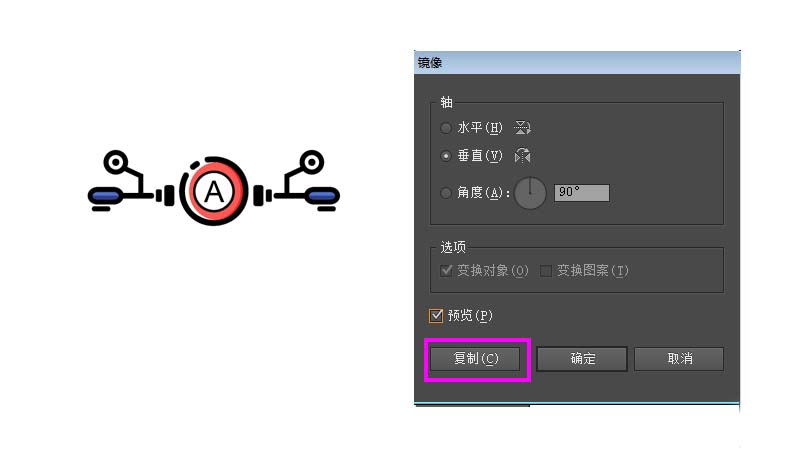 第六步:选中上一步中的组,单击工具面板中的"镜像工具",设置参数如下图所示,单击复制按钮