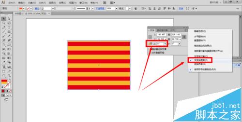 1、我们先选中画布上的图形,然后在变换面板右边的下拉面板里选择”仅变换图案“,我们也可以在变换面板里面会看到角度旋转一栏前面有个提示”变换将只应用于所选对象的图案填充“