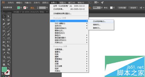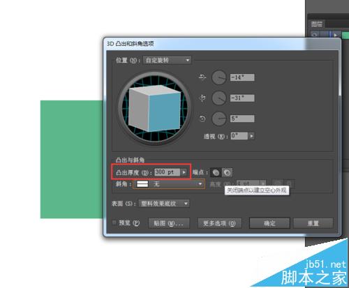 4、选中正方形的情况下,点击“效果”—“3D”—“凸出和斜角” 然后会弹出一个设置框,在“凸出厚度”那里输入300,和你正方形的大小保持一致