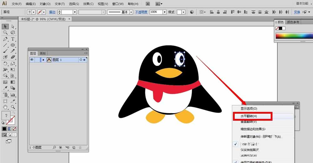 6、在全部选中第二只眼睛的基础上,右击——水平翻转,把第二只眼睛整体翻转过来