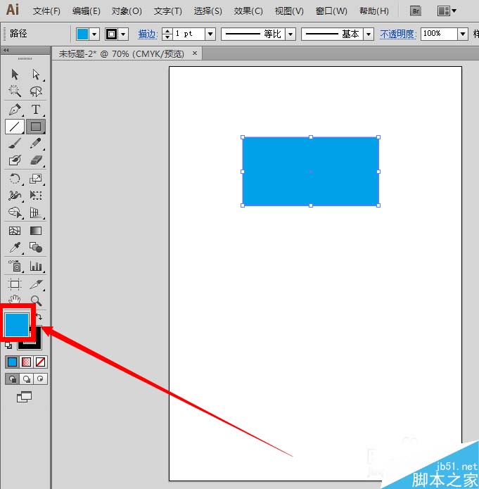 1、使用矩形工具,随意在画布上绘制一个图形,比如蓝色矩形