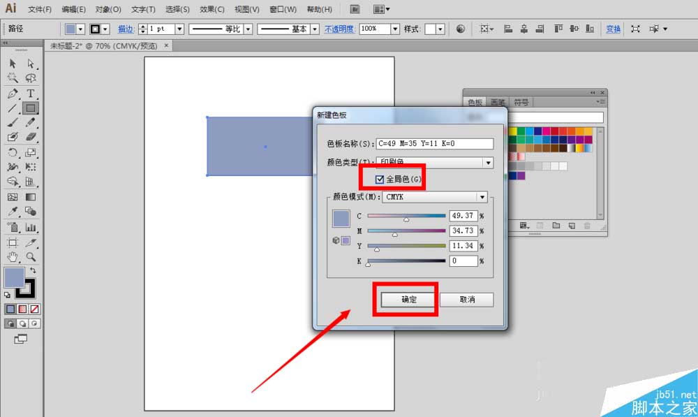 5、在弹出来的“新建色板”面板上,第二栏颜色类型底下有个“全局色”,在“全局色”前面的小正方形里面单击打上勾,接着点击下面的确定按钮