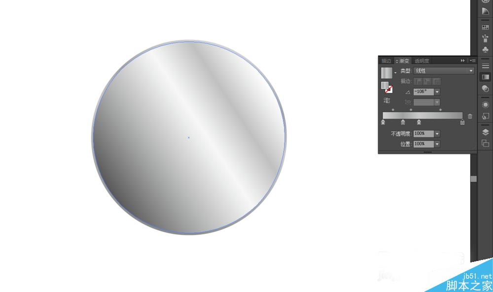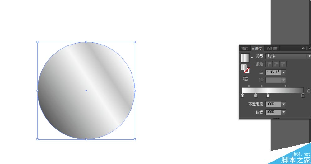 1、新建AI文档,用椭圆工具绘制一个正圆。并将其填充渐变色,类型为:线形,角度为:-146.7 。最左边的渐变滑块设置颜色为(C:0、M:0、Y:0、K:0),左起第二个渐变滑块设置颜色为(C:0、M:0、Y:0、K:35),“位置”为22,左起第三个渐变滑块设置颜色为(C:0、M:0、Y:0、K:5),“位置”为42,最后一个激变滑块设置颜色为(C:0、M:0、Y:0、K:80)。