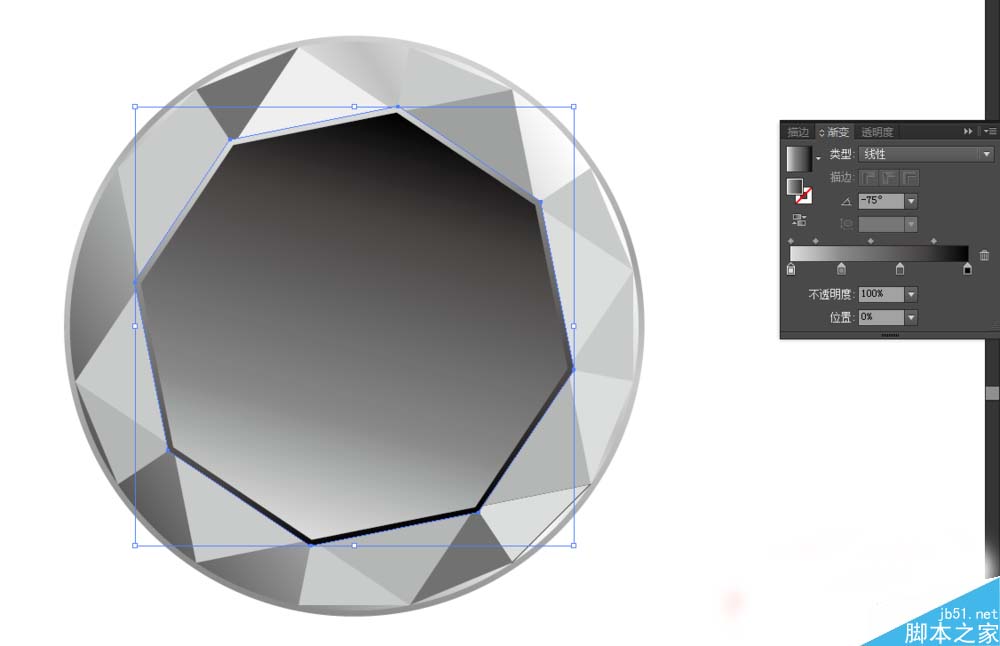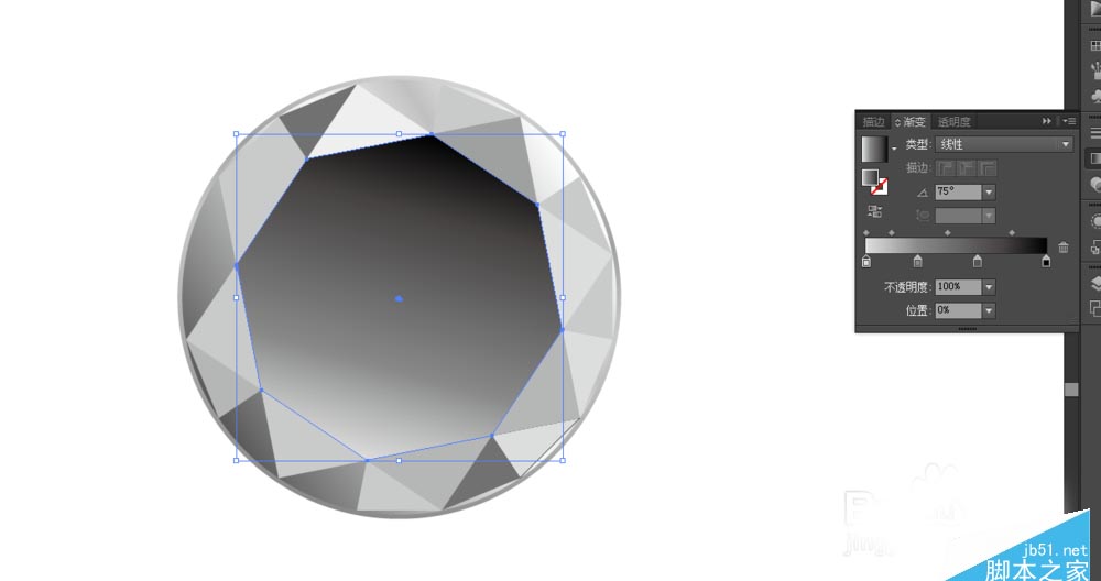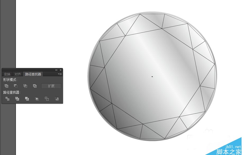 4、对刚刚绘制的多边形长线框取消描边,用“路径查找器”面板中的“分割”对多边形进行分割,然后用选择工具,选择里面的小三角形进行联集合并,然后对八边形外的小三角形进行填充灰色,各个色值的灰色。同时对里面的八边形进行渐变填充,色值偏深一点,蹆之前的差不多。