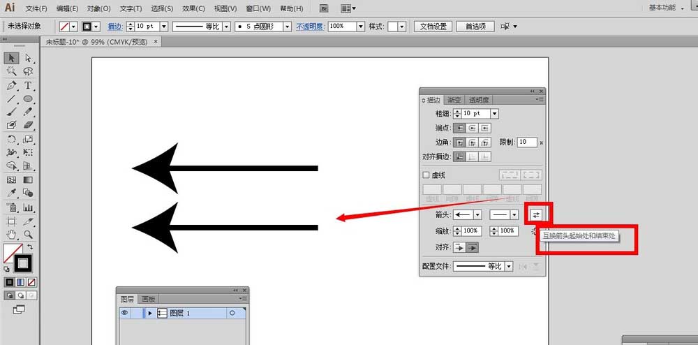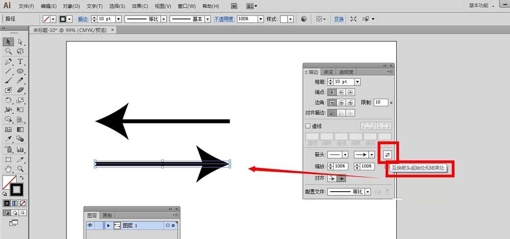 6、当我们选中第二个箭头,再用鼠标点击”互换箭头起始处和结束处“按钮,会发现箭头的方向向相反的方向变了。