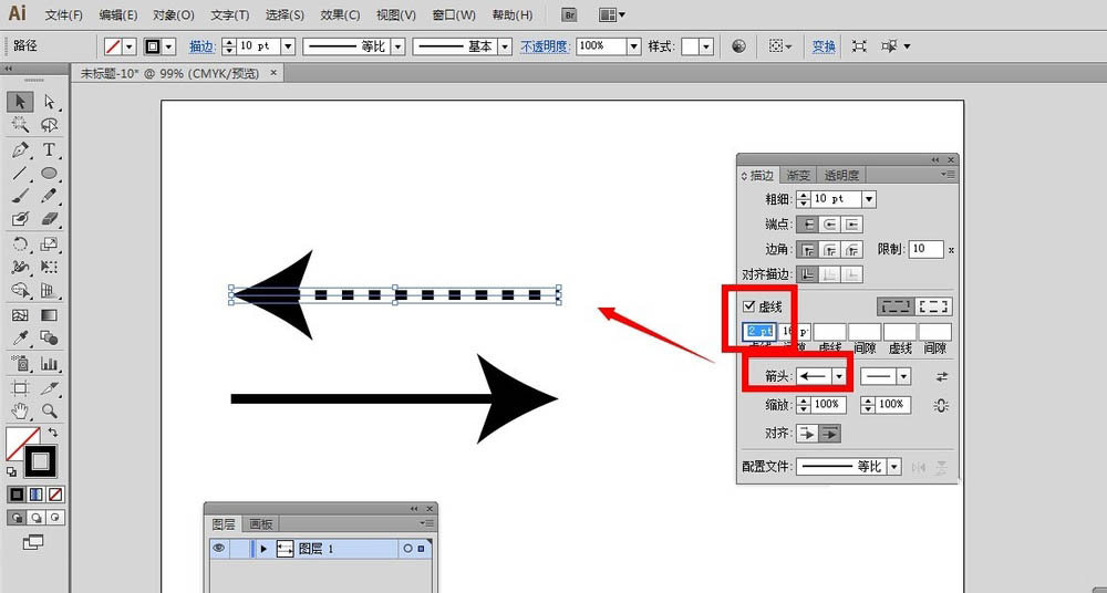 7、如果我们再结合前面学习过的虚线知识,选中第一个箭头,再在虚线前面打勾,启动虚线,会得到这样的箭头。以后可以根据需要绘制不一样的箭头样式。