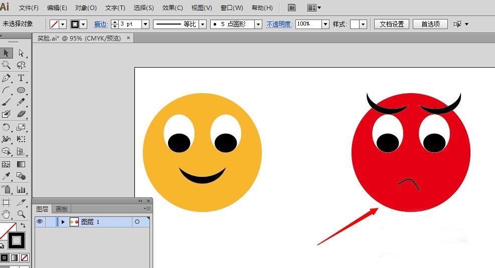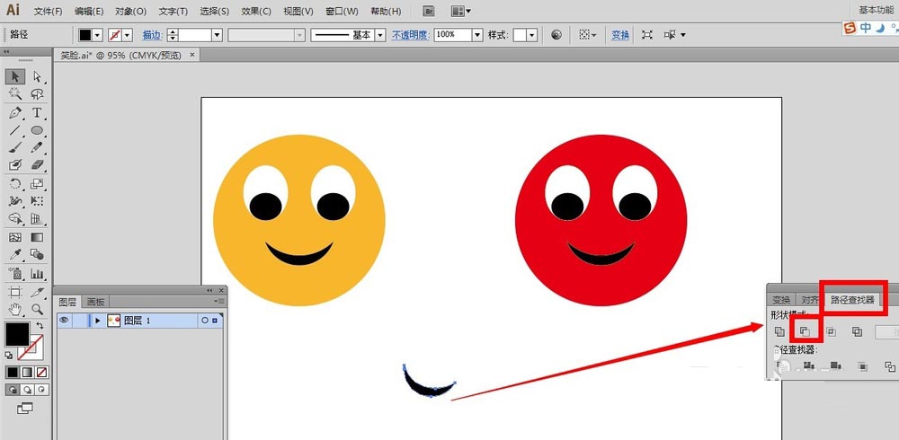6、选中红色笑脸的嘴巴,点击键盘上的delete键,把笑脸的嘴巴图形删掉
