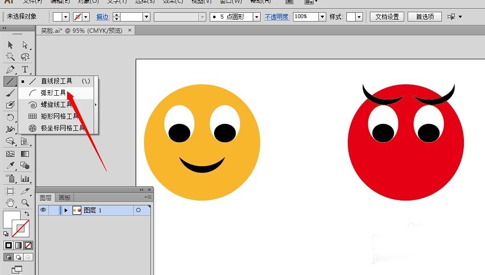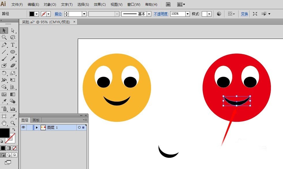 11、把画好的黑色弧形移动到红色表情的放嘴巴的地方