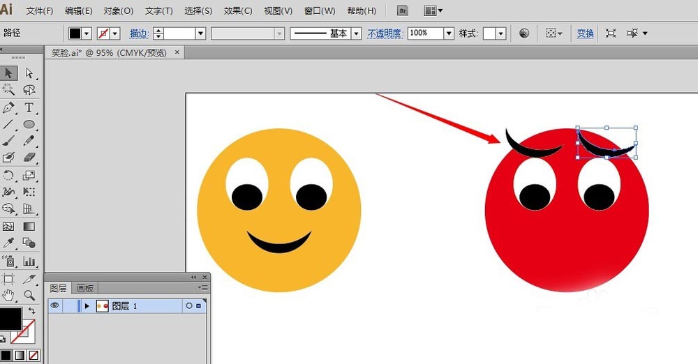 8、然后把之前画好的黑色弯弯图形移动到红色表情的眼睛上方,作为眉毛,并且复制出另一个眉毛