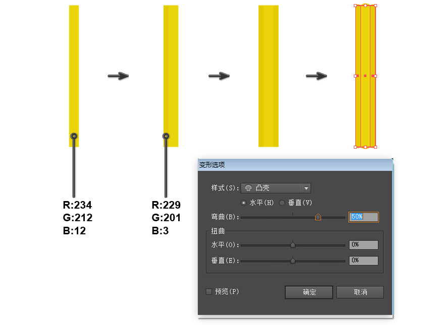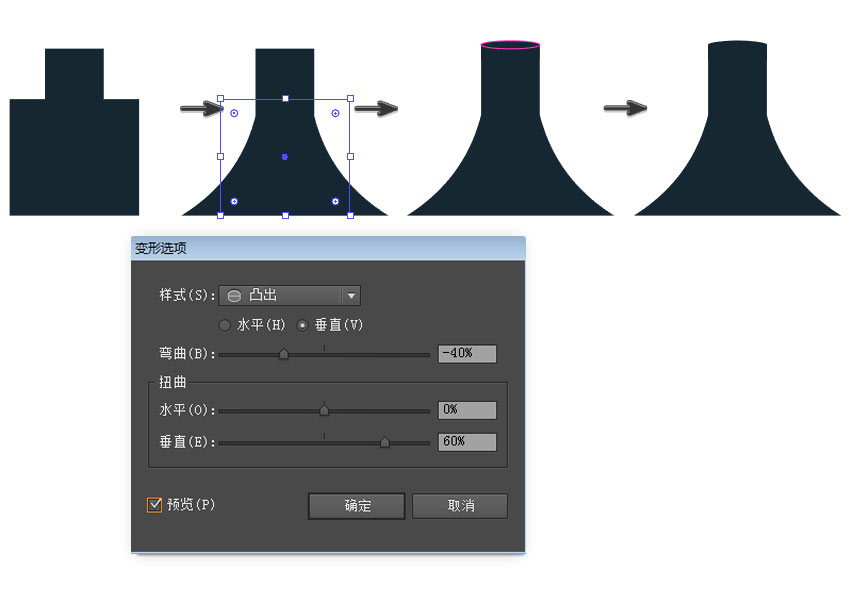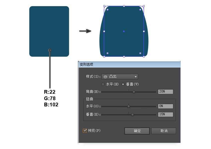 第一步:使用圆角矩形工具画一个圆角矩形类似于如下所示的形状。同时保持它,选择效果>变形>凸出。在新的对话框中调整选项如下图所示: