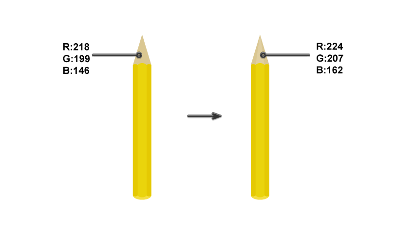 第三步:使用多边形工具画一个浅棕色的三角形,(点击画板后,会弹出一个新的对话窗口。输入3,任何半径。)使用直接选择工具(A)调整三角形的锚点到合适的形状,然后在使用多边形工具画一个三角形下图,填充颜色如图所示;选中第一个三角形,复制出副本,水平旋转,将这个三角形编组,然后放到铅笔主体的下面,如下图所示: