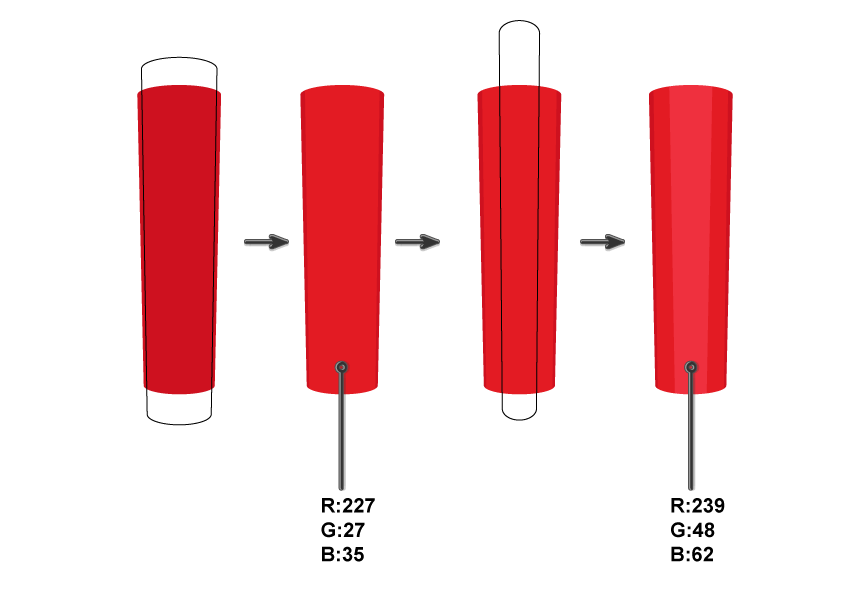 第一步:创建一个850 x 850像素的画布。(注意:为了能够精确地移动的物体,需要启用智能参考线,视图>智能参考线)使用矩形工具(M)画相连的三个矩形。填充颜色如下图所示。中间的矩形的颜色稍浅。然后选择所有三个矩形,去效果>变形>凸出。在新的窗口中输入如下参数: