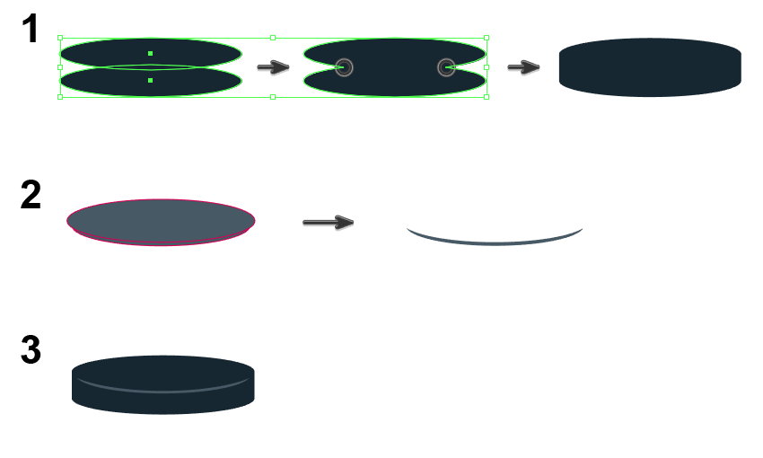 第三步:画两个椭圆互相重叠如下图(1)。打开路径查找器,形状模式选择"联集"会得到一个形状。使用删除锚点工具(-)删除左右锚点,接下来,使用椭圆工具画两个灰色椭圆,几乎互相重叠。打开路径查找器,形状模式选择"减去顶层"会得到一个形状(2)。最后将两个图形放置如3的位置: