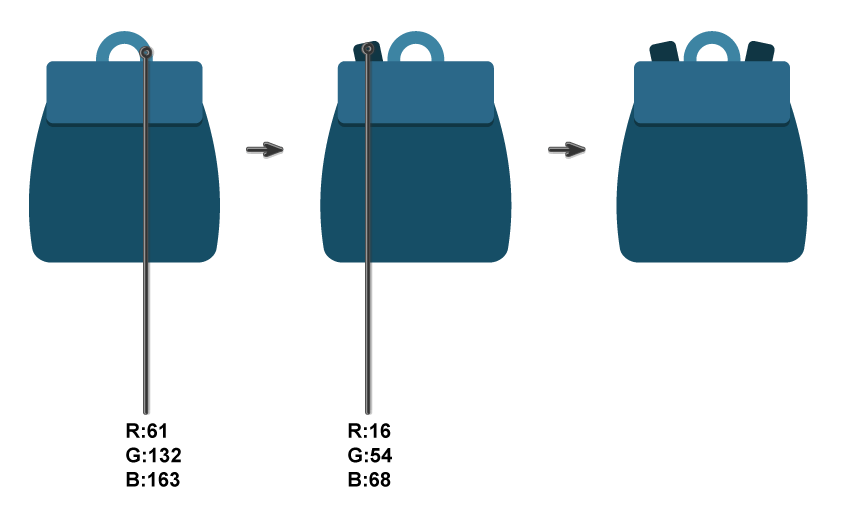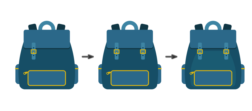 第四步:口袋,使用圆角矩形工具画一个圆角矩形,填充颜色,在圆角矩形上面添加一个黄色的矩形,然后编组,放在背包整体的后面,如下图所示: