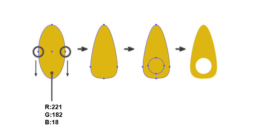 第五步:添加背包的拉链。使用椭圆工具(L)画一个椭圆,填充黄色,使用直接选择工具(A)选择椭圆的左、右锚点向下拉。使用椭圆工具的同时按下shift键创建一个圆,选择这两个形状,,打开路劲查找器面板,形状模式选择"减去顶层";如下图所示: