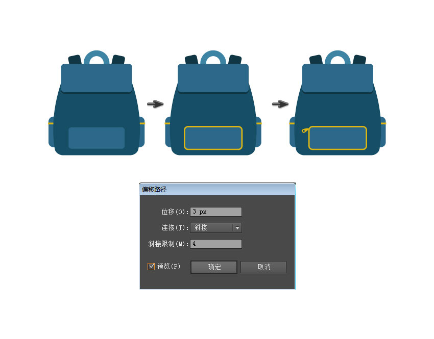 第六步:前面的口袋;使用圆角矩形工具画一个圆角矩形,填充蓝色(#2b6889),选中圆角矩形,单击"对象-路径-偏移路径",输入参数如图所示;然后使用吸管工具,点击黄色的拉链,把拉链放在前面的口袋上面,如下图所示: