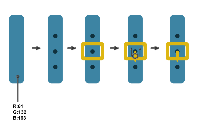 第七步:创建扣: 使用圆角矩形画一个比较窄一点的蓝色圆角矩形,使用椭圆工具(L)的同时按下shift键画一个正圆,同时按住Shift和Alt键复制出一个圆。单击Control-D复制出第三个。皮带扣,使用圆角矩形工具画一个圆角矩形,填充描边颜色,使用椭圆工具(L)画一个椭圆,使用直接选择工具(A)选择椭圆的左右锚点向上拉,选中整个扣,编组(ctrl+G),如下图所示: