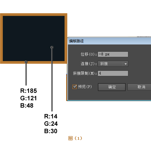 第一步:使用矩形工具(M)画一个矩形,填充颜色;然后选中矩形,单击对象-路径-偏移路径,输入如下参数(图1):得到另一个矩形;修改颜色为暗灰色;