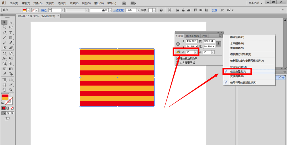 1、我们先选中画布上的图形,然后在变换面板右边的下拉面板里选择”仅变换图案“,我们也可以在变换面板里面会看到角度旋转一栏前面有个提示”变换将只应用于所选对象的图案填充“