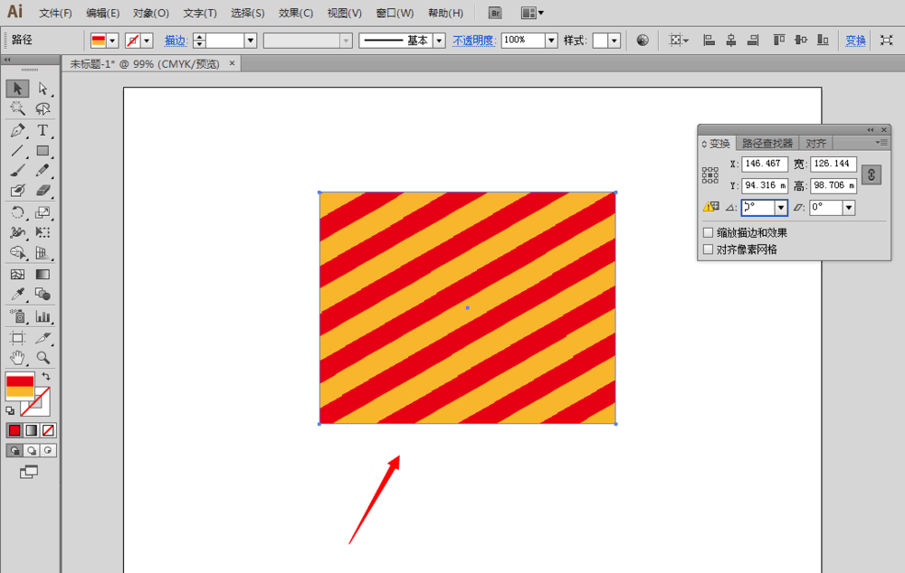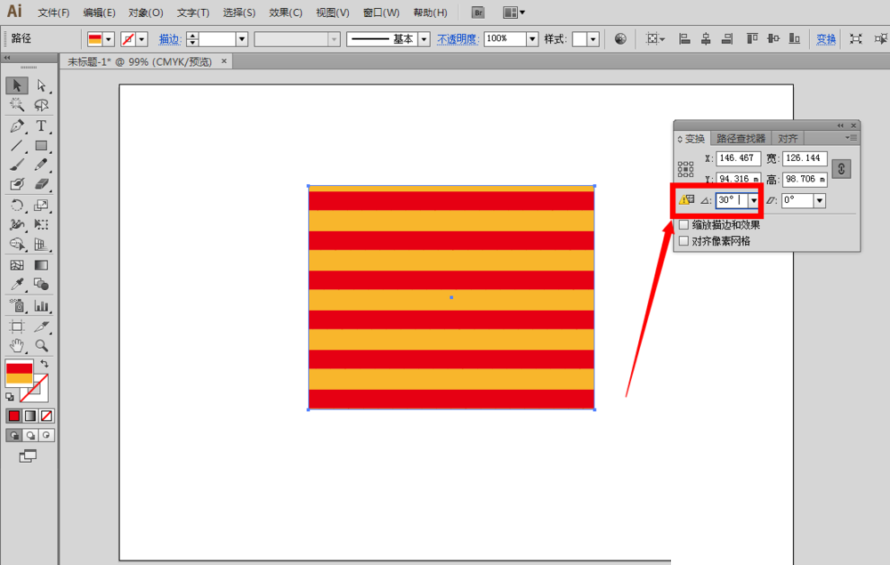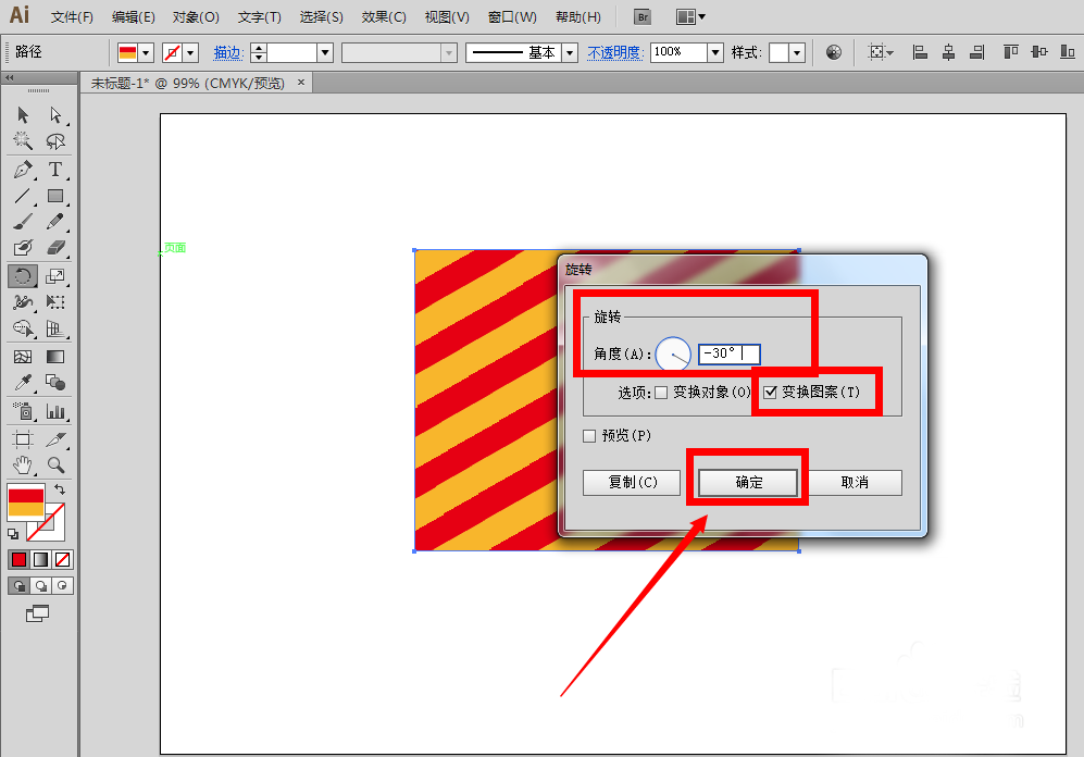 3、确定以后,我们可以看到画布里的图形发生了变化,里面的条纹图案旋转了30°