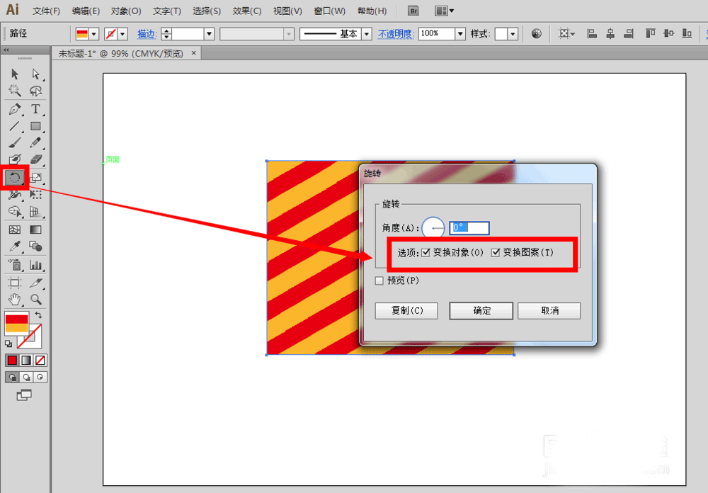 4、想要旋转条纹图案,我们还可以双击左边工具栏里的旋转工具,在弹出来的设置面板里设置数值