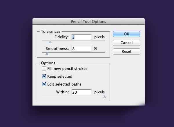 3、双击铅笔工具来编辑其设置。改变富达和平稳周围的3px和8%,但调整这些设置,以满足您自己的喜好,如果你的铅笔线条不被绘制为准确或那样顺利,你会喜欢的。两个重要选项也选择保留选择和编辑选择的路径