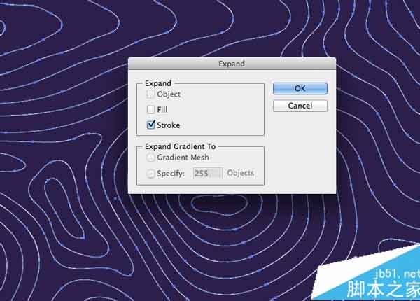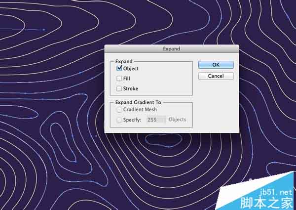 22、按CMD + A全选,然后前往对象>扩展。选择刚才对象选项,然后点击确定。这将所有这些混合转换成可编辑的对象。