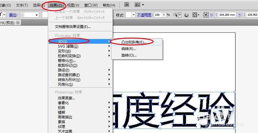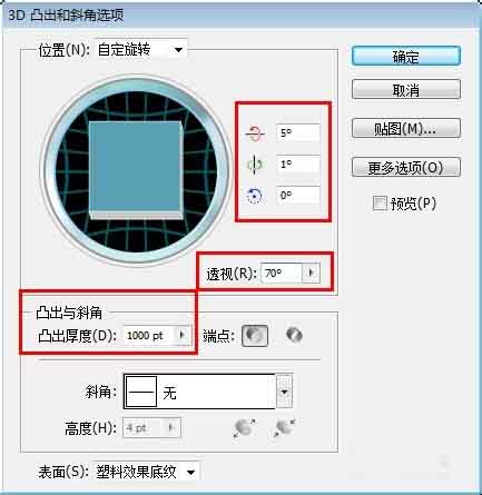 4、然后,点击菜单【效果】-【3D】,在子菜单中选择【凸出和斜角】命令,弹出设置对话框。调节上面X轴、Y轴、Z轴参数值分别设置为5,1,0,改变旋转角度;透视参数设置为:70,改变视角;凸出厚度参数设置为1000,显示三维立体深度。朋友们可以自己调节下参数,就理解含义了。设置完成后,点击确定。