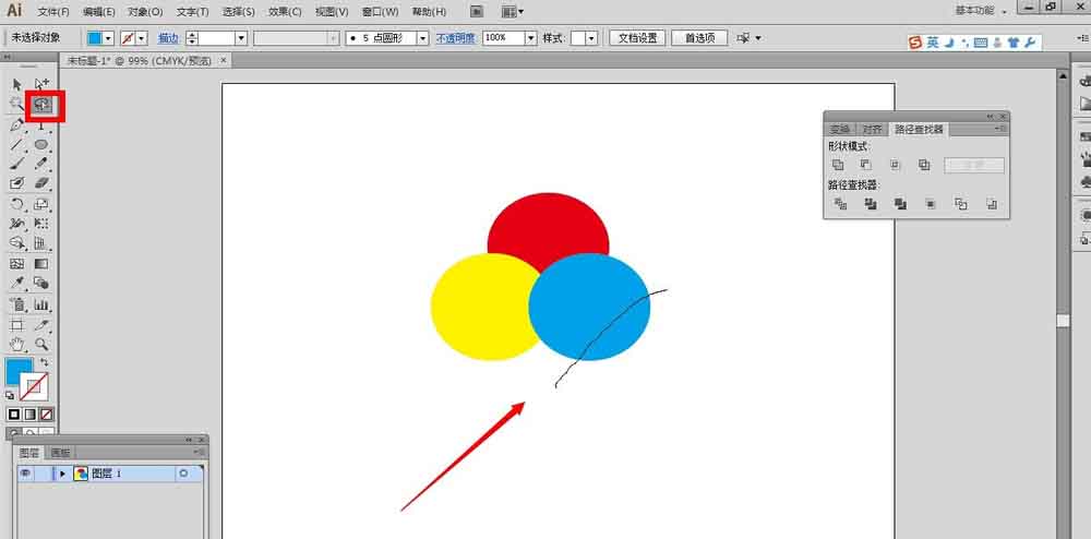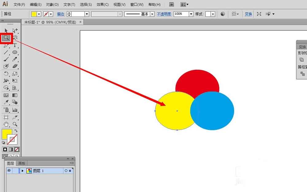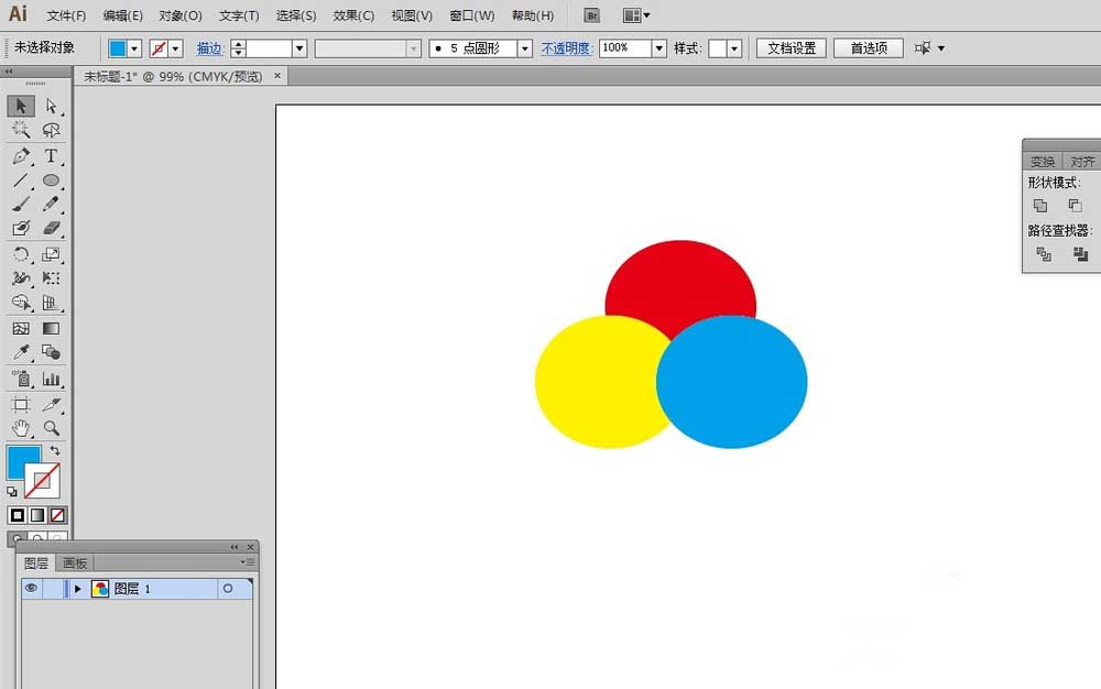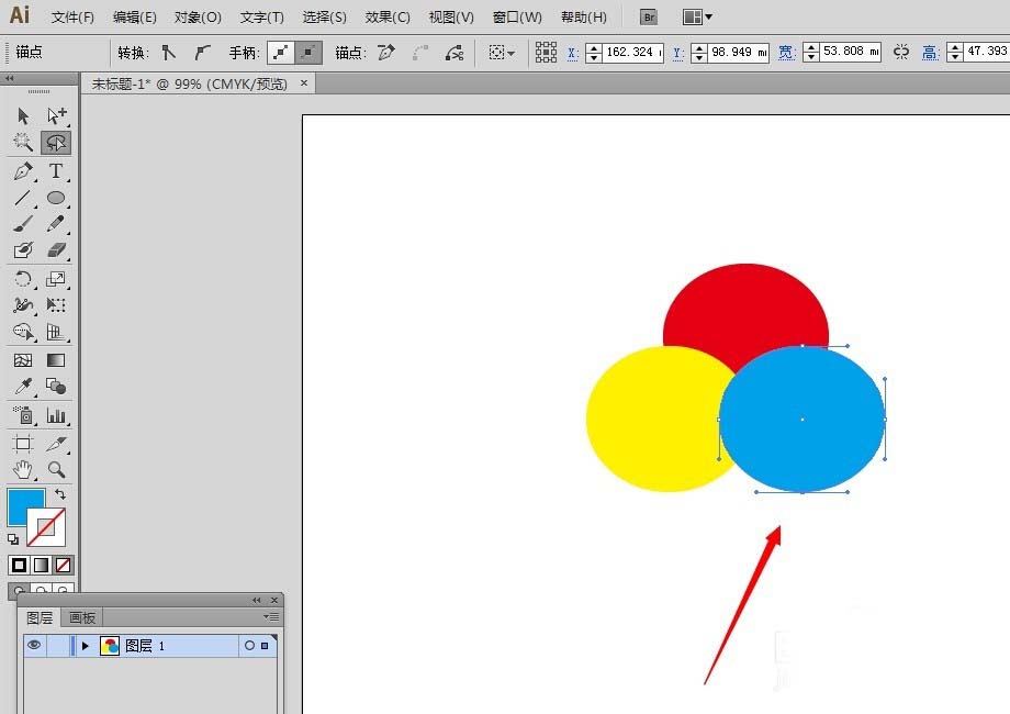 1、新建画布,举个例子,在画布上任意绘制三个不一样的颜色的椭圆形