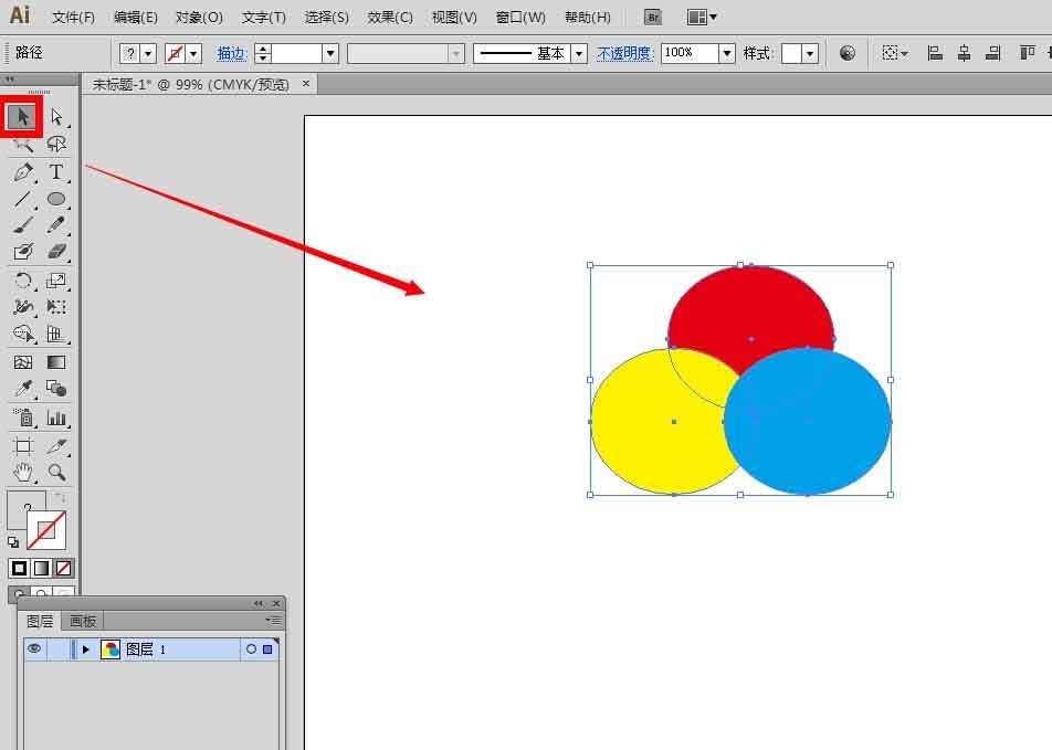 第一种选择方法,我们可以使用黑色箭头“选择工具”选择,单击其中一个图形就可以选中那个相应的图形,框住全部图形,可以选中整体
