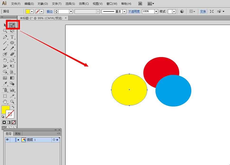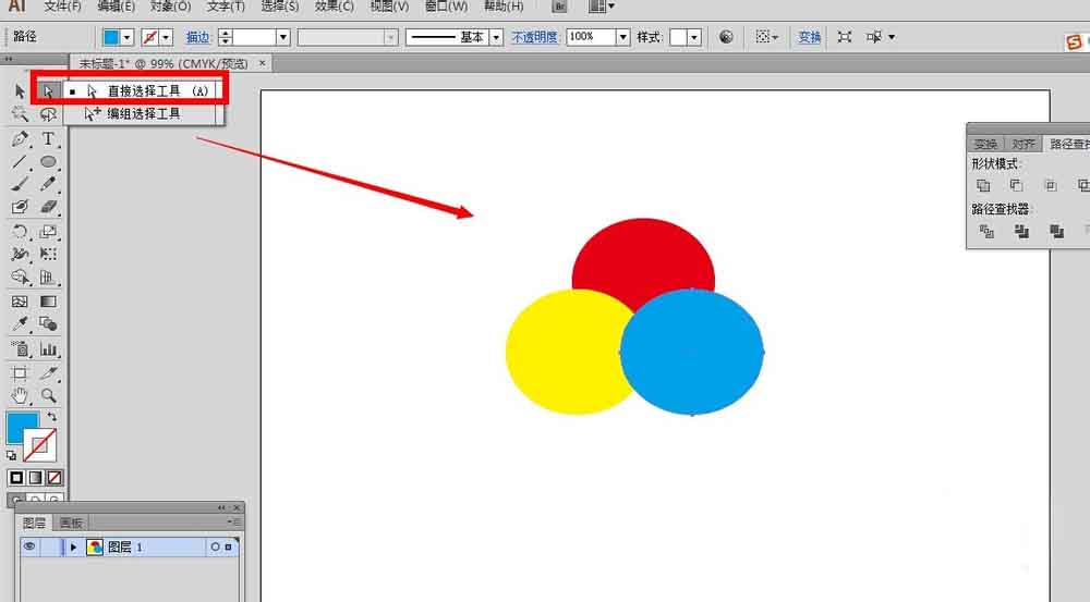 第二种选择方法,我们可以使用白色箭头“直接选择工具”选择,单击其中一个图形就可以选中那个相应的图形,框住全部图形,也可以选中整体
