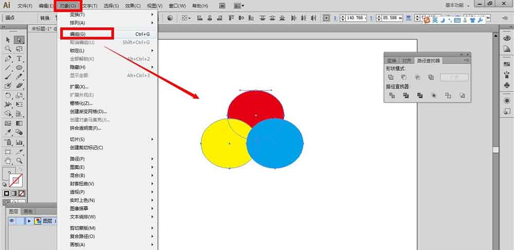 第三种,使用“编组选择工具”选择,我们先把所有相关的图形进行编组,选中全部图形,点击“对象”——“编组”