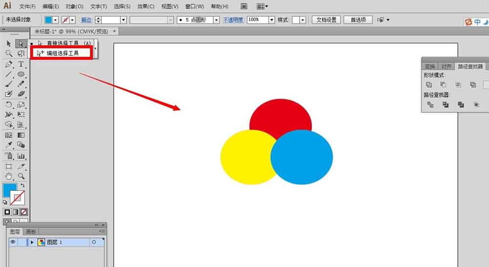 此时,我们可以使用“编组选择工具”单击我们要选择的图形,这样就可以选中它了,单独移动了