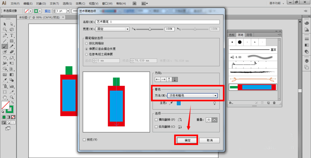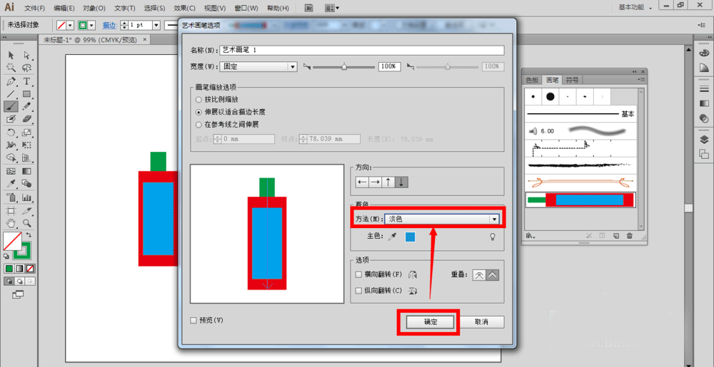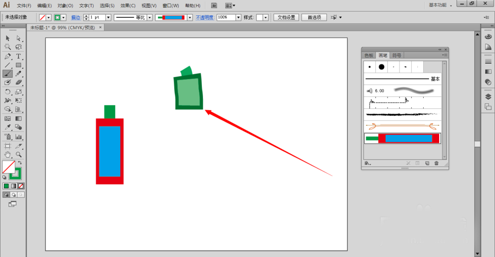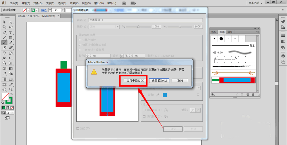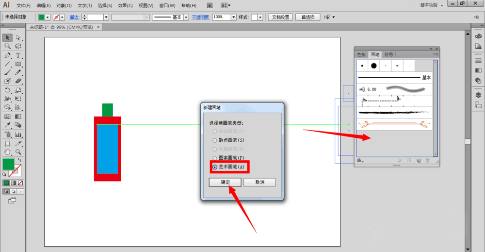 2、选中画布上的图形,直接拖拉到画笔的空白处,弹出新建画笔面板,比如选择艺术画笔,点击确定按钮