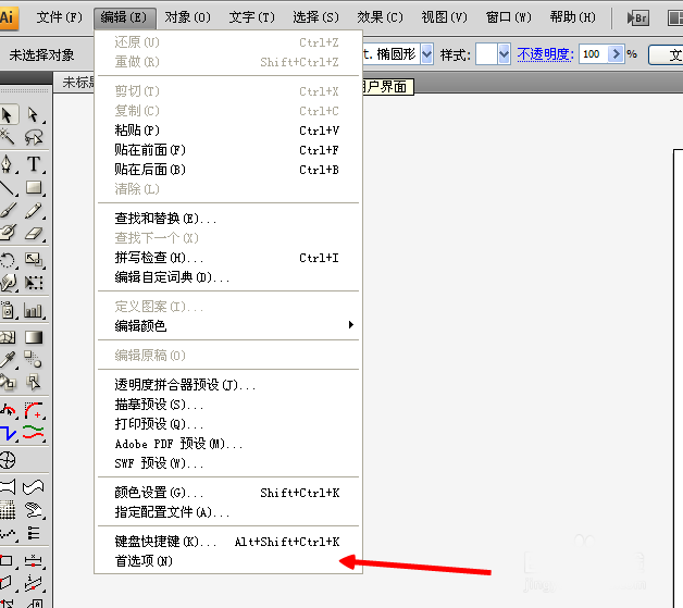 4、新建画布之后,我们点击上边的编辑的选项,然后找到最后一项,首选项的选项。