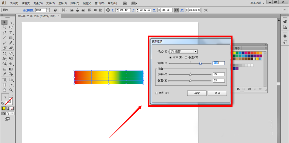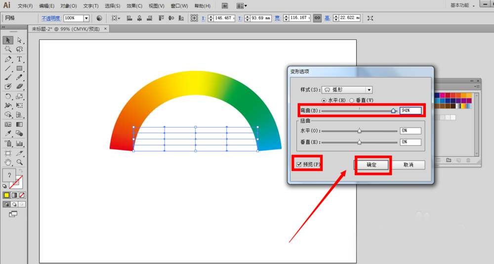 9、在预览前面打上勾可以看到自己设置一定的数值得到的相应的效果,我们调整下弯曲比例,比如94%,点击确定按钮