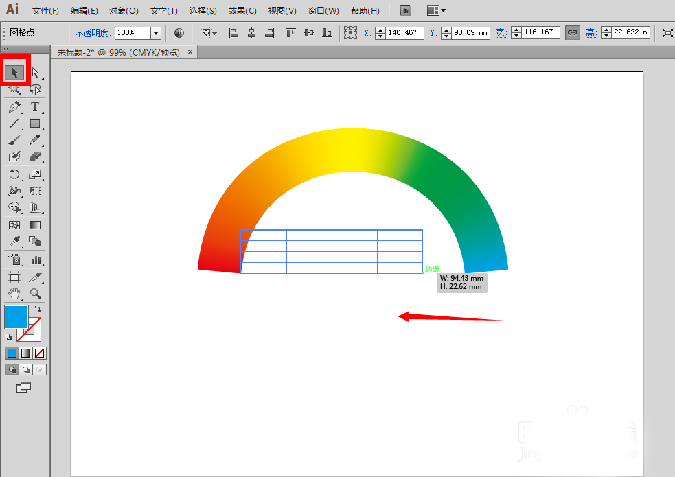 10、确定以后,可以得到彩虹图形,在画布上我们还可以使用选择工具,直接缩小或者扩大网格来改变彩虹的大小、位置