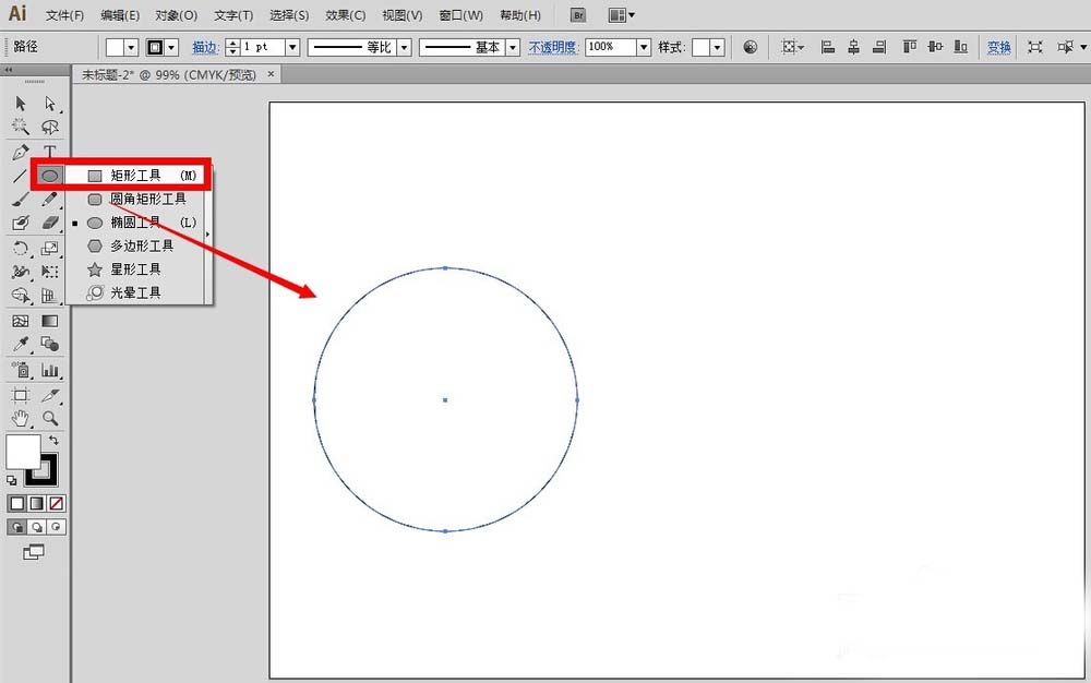 1、先建立合适的画布,然后选择矩形工具,按住shift键,在画布中绘制一个正圆图形