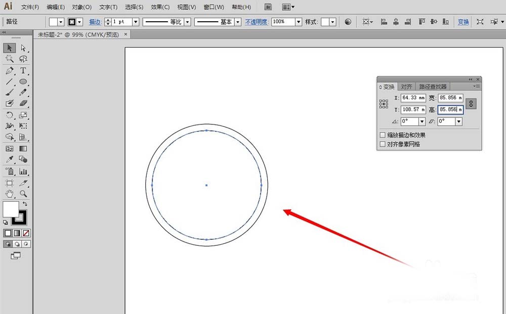 2、然后调出变换面板,参考点设置为中心点,按下等比缩放链条,然后在宽数值设置栏,减去一个数值,比如10mm