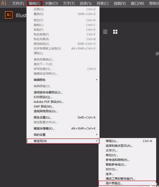 1、打开AI后,选择【编辑】-【首选项】-【用户界面】,如下图红框区域所示。