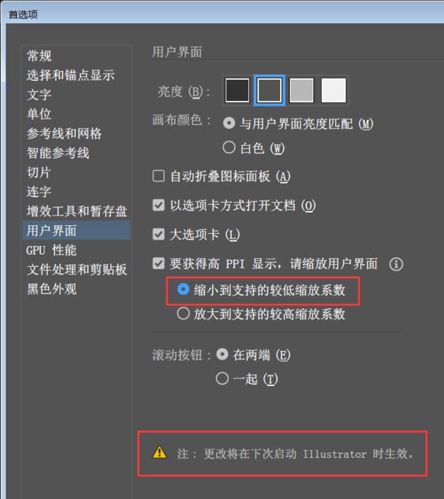 3、下一步选择“缩小到支持的较低缩放系数”,随后需要重启AI。
