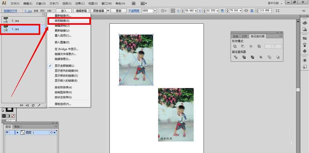 2、我们点击”链接文件“,在弹出的面板里面会看到很多置入图的缩略图,名称,我们用鼠标单击其中一个,再点击面板下拉按钮里面的”转到链接“