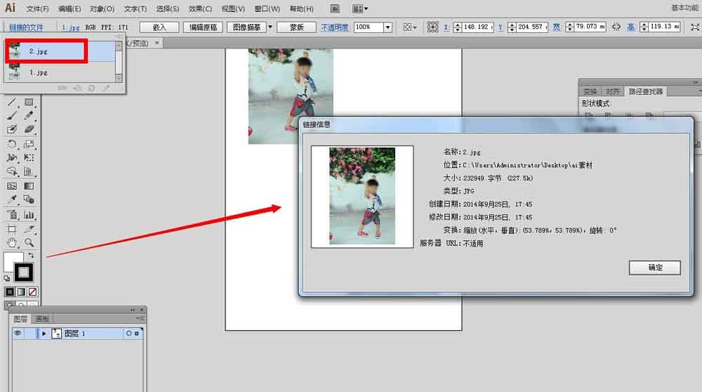 4、当我们在置入面板里面,双击任意其中一个要置入的图片的缩略图,会弹出该图的详细信息